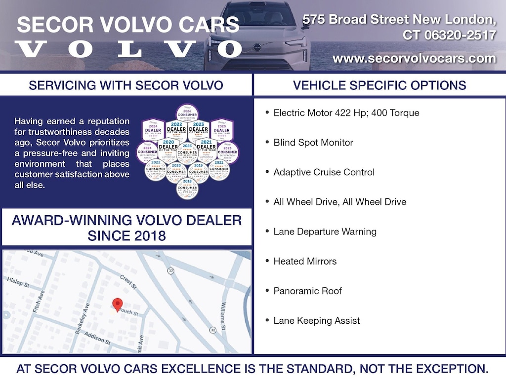 Secor Volvo Received the 2025 CT Volvo Dealer of the Year Award for the 6th consecutive year as well as the 2026 Consumer Satisfaction Award for the 9th year in a row - Consumer Satisfaction Awards recognize the top 10% of auto dealerships delivering exceptional customer service. Did you know? Volvo has used American Chiropractic Association Certified Seats Since 1999? Just one of the reasons that once you own a Volvo, you always own a Volvo. The most comfortable seats for bad backs, nerve damage, arthritis and more! World class luxury crossover, SUV and EV Volvo vehicles, right at your fingertips. We're right off of I-95 exit 82, easy to get to, near you and can come to you if need be. You Get more at Secor Volvo Cars.