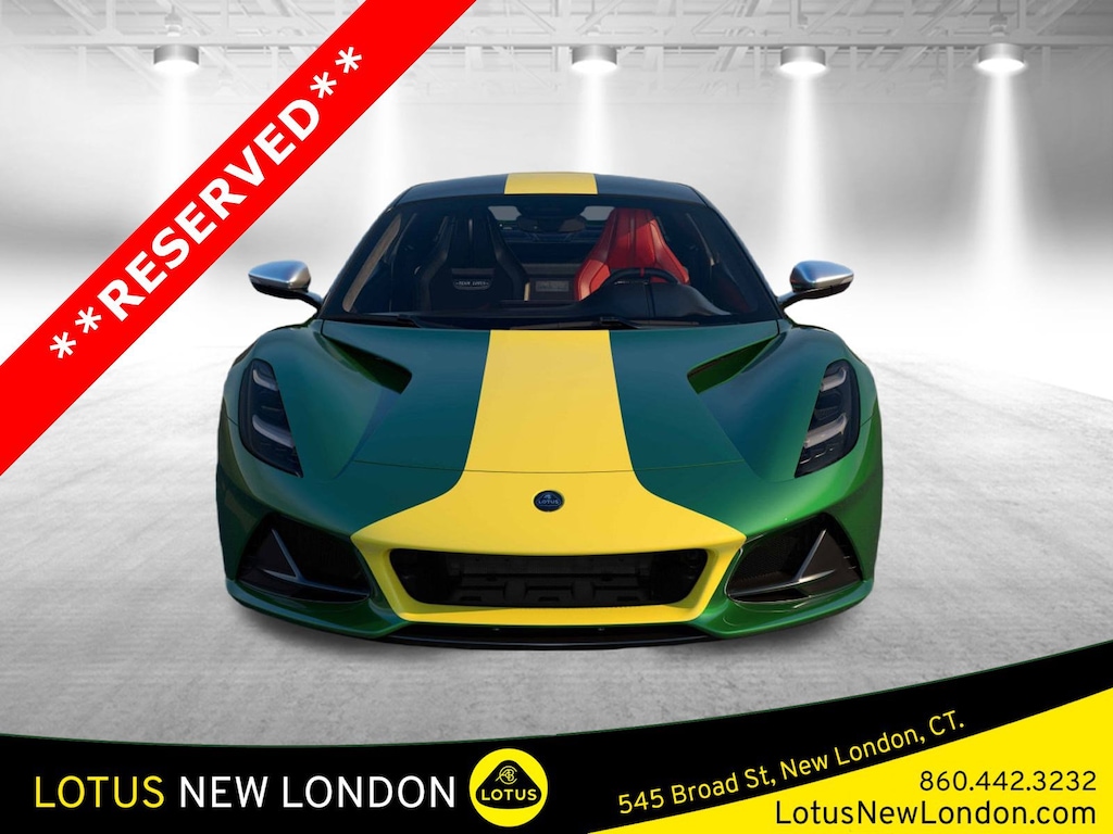 DRIVER CONVENIENCE AND SAFETY 12 Volt power supply, centre armrest storage Type C USB connector USB Connector-type A arm rest - data and charge USB Connector - lower centre console (USB Connector-type A charge only) Driver and passenger door bin storage with integrated armrest Driver and passenger cup holders Centre armrest and stowage bin Interior White lighting 12-way electric power seat Memory and heated seats Single Zone Climate Control HMI Screen: 10.25" landscape orientation, high resolution 12.3" TFT instrument display Bluetooth® Apple CarPlay Android Auto KEF Premium branded high end audio system Driver and Passenger airbags Curtain and Thorax airbags Lotus Convenience Pack EXTERIOR Clark Racing Green exterior paint Clark Edition bespoke yellow painted livery Clark Edition Yellow Tailpipes Red Brake Calipers Full Black pack excluding mirrors Machined aluminium fuel filler with blue anodised centre C-pillar union flag badge with V6 embossed aluminium Clark Edition painted decal on front fenders Satin Chrome "Lotus" lettering Black and Silver "Lotus" badges