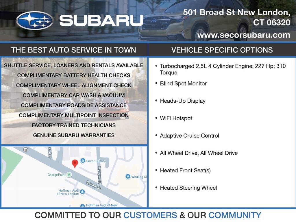 Speak to a member of our dedicated team at 860.442.2323 or online at SecorSubaru.com. We're a community dealer for the people that continually strive for greatness by giving back to our local partners, including: Thames Valley Council for Community Action (TVCCA) Meals on Wheels Garde Arts Center Connecticut Humane Society Kiwanis International Rotary International The Connecticut Shoreline Photo Family Secor Subaru - 5 Minutes off I-95! Although every reasonable effort has been made to ensure the accuracy of the information contained on this site, absolute accuracy cannot be guaranteed. Please call us to confirm pricing. This site, and all information and materials appearing on it, are presented to the user "as is" without warranty of any kind, either express or implied, including but not limited to the implied warranties of merchantability, fitness for a particular purpose, title or non-infringement. All vehicles are subject to prior sale. Price does not include applicable sales tax, title, license, and $599 dealer conveyance fee. Not responsible for typographical errors. The Love Promise Pillars are essential to our dealership and we are consistently giving back to our local community with our commitment to caring as we Share the Love.